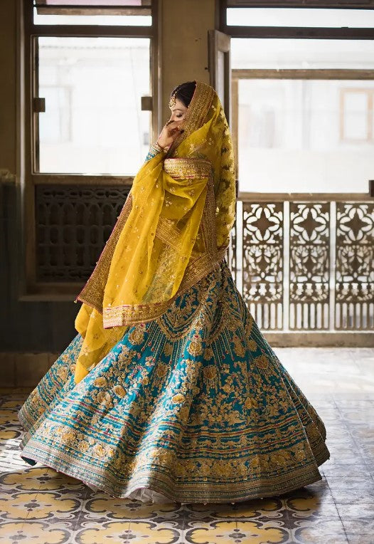 Mehrunisa features an aqua-blue Pishwas set that glistens with gleaming gold details. The ethereal fabric brings out mesmerising blend of serenity and splendour. Draped delicately, a yellow dupatta adorned with golden accents completes this enchanting ensemble that ignites dreams of timeless elegance and boundless beauty.