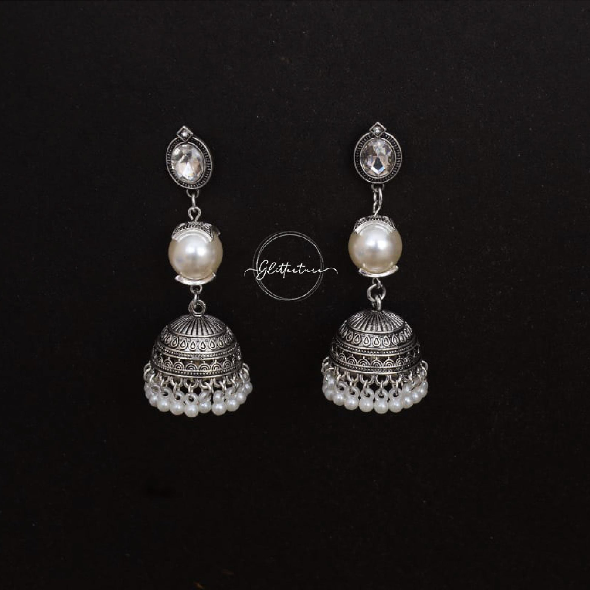 Beautiful jhumka pair with white pearls.Complete your festive look with these classy jhumka.