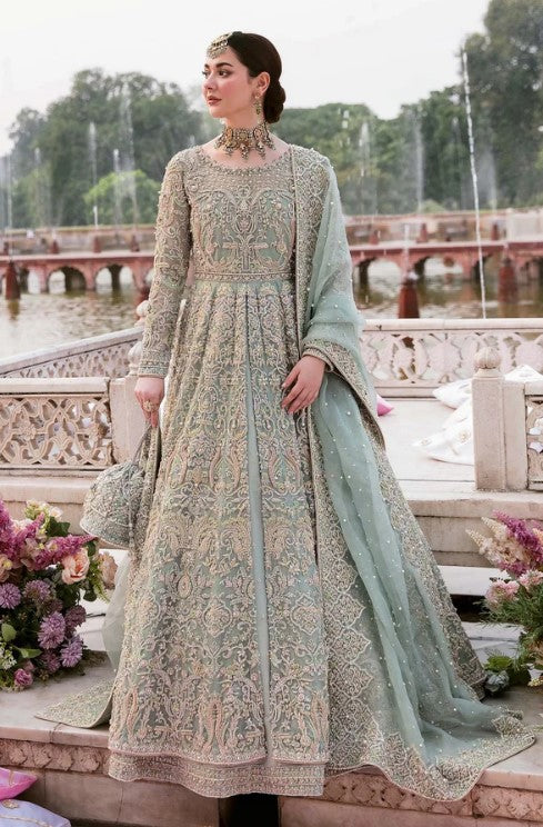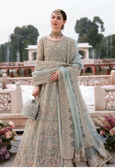 A chic and feminine couture look, “Saleha” consists of ice blue hued organza gown, bejeweled with naqshi, dabka, crystals, pearls, and sequins. Paired with self jamavar lehanga, with embellishment on the border. The outfit is paired with heavily embellished organza dupatta with all around border and center spray of motifs and pearls.